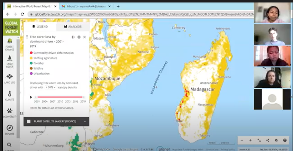 The first webinar was on QGIS, a technological field that incorporates geographical features with tabular data in order to map, analyze, and assess real-world problems. The second webinar was on SMART, which combines field-based data collection with analytical mapping and summary tools, so patrol efforts can be more efficient and successful at reducing poaching or other illegal activities within protected areas. Finally, the third webinar on Global Forest Watch which provides data and tools for monitoring forests in near real-time, allowing anyone to view where and how forests are changing around the world. All of the training included a second session to answer questions and further clarify aspects of these technologies.